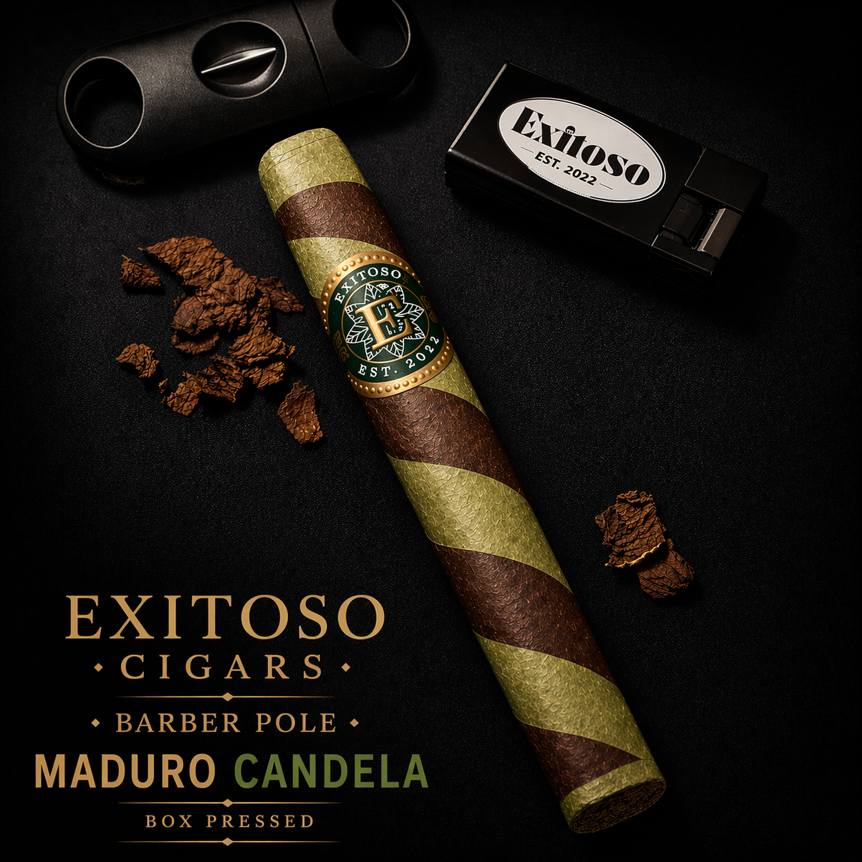 Profile: Exitoso Maduro & Candela Barberpole is a striking, dual-wrapper cigar that delivers contrast in both appearance and flavor. The intertwining of dark San Andrés Maduro and vibrant Candela creates a dynamic smoking experience—balancing richness with freshness.